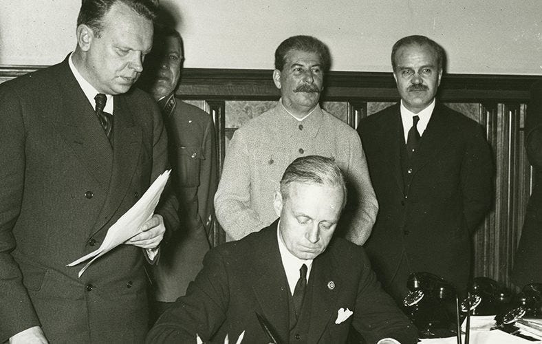 In fact McMeekin has simply told the story of the war as Stalin understood it. He was at war against the capitalist world, including Germany, and merely divided that world against itself to conquer it. The infamous Molotov-Robbentrop agreement that partitioned Poland was aimed at getting France and Britain to fight Germany. The infamous Soviet-Japanese Neutrality Pact was aimed at encouraging Japan to fight the Americans. Seen from Stalin’s perspective, the war was a brutal expansion of Soviet hegemony, funded and powered by capitalism, both through subterfuge and open browbeating, by getting all his enemies to fight each other, each becoming an ‘ally’ or neutral until he was ready to turn on them again.