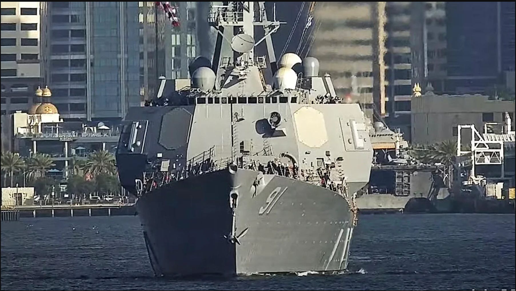 Referring to the above diagram, AN/SPY-6(V)1 is a radar system that can track multiple objects and guide the weapons on board the ship to target them. SEWIP Block III is the AN/SLQ-32 electronic warfare suite featuring an AESA (active electronic scanning array) that can create pencil-thin beams of radio energy to jam or spoof the control signal receivers on board those objects. The two systems are complementary by design. They proved their worth in the Red Sea, costing pennies per use. But they both require four large, flat surfaces and together they widen the superstructure. This is a hard engineering fact, not a political point.