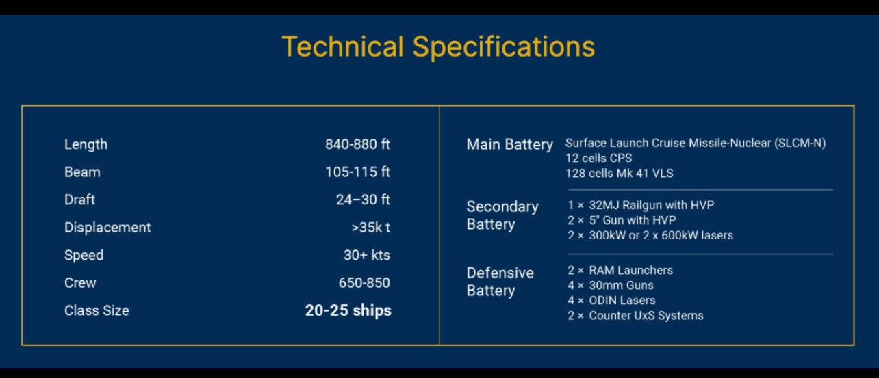 But it’s the cheeks of this thing that require it to the size of a battleship, so that we might as well agree to call it one, and this is not negotiable in the Navy’s next class of surface combatant. Anyone who has laughed at the ridiculous appearance of older Arleigh Burke-class destroyers retrofitted with superstructures that overhang the sides of the ship to accommodate these systems will have already perceived what is actually going on, here. American fighting ships must be wider, which means longer, which means more displacement. The above specs put this thing at 3.5x the displacement of a Ticonderoga-class cruiser. What other word would you like to use for it?